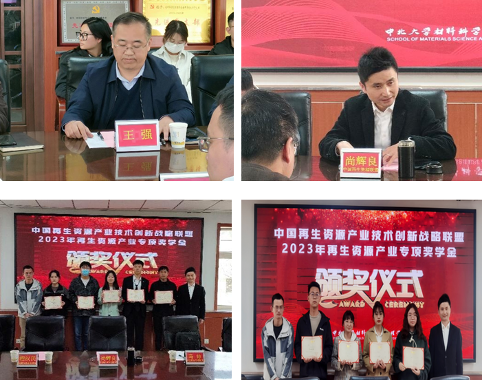 2023年2月28日,中国再生资源产业技术创新战略联盟在我院设立“再生资源产业专项奖学金”。经学院材料初审、学生答辩、评审小组评议等环节,共有9名本硕学生获得该奖学金。交流会前,首先进行了奖学金颁奖仪式,王强院长宣读《2023年再生资源产业专项奖学金》获奖学生名单。联盟尚秘书长与鸿劲铝业程副总经理共同为获奖学生颁奖。
