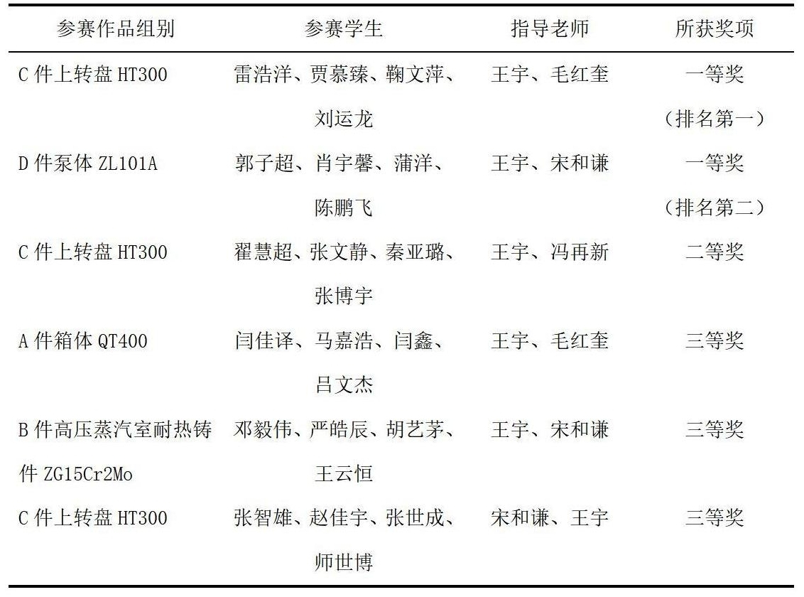 表1 2023铸造工艺设计赛中北大学获奖名单