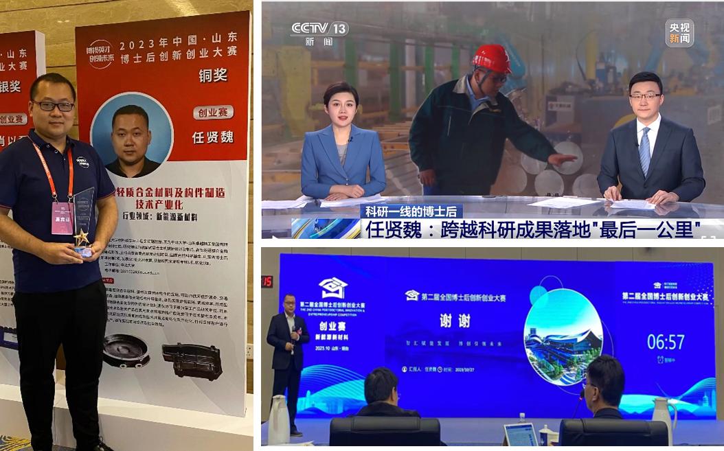 在站期间,任贤魏与企业开启校企合作,作为项目负责人,他承担了山东省重点研发计划项目1项、山东省博士后创新项目1项。在全国博士后创新创业大赛中,分别获得了济宁市金奖(2022年、2023年)、山东省铜奖(2023年)、全国创业组-新能源新材料赛道优胜奖(2023年),参赛的“高端轻质合金材料及构件制造技术产业化”项目为金属材料制造领域的唯一获奖项目。任贤魏及其团队成果与事迹介绍,分别在兖州人社、济宁人社及山东博士后宣传平台上进行了推广。