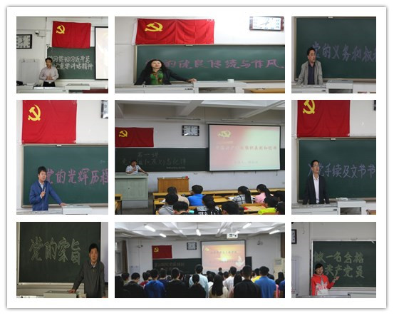 我院党委副书记廖海洪做了开班第一讲——《党的组织原则与纪律》。来自学校党政部门及各学院负责党务的老师相继授课:校党委组织部副部长雷丽蓉《党的优良传统与作风》、后备军官教育学院党委书记尹建平《党员的权利和义务》、艺术学院党委书记曹凤才《党的光辉历程》、校党委组织部干部科科长孙俊伟《入党手续及文书写作》、我院党建辅导员李艳《做一名合格的党员》、化工与环境学院党委书记李运芝《学习贯彻习近平总书记重要讲话》、计算机与控制工程学院党委书记郭书杰《党的性质》、校党委组织部胡向明《党的宗旨》。
