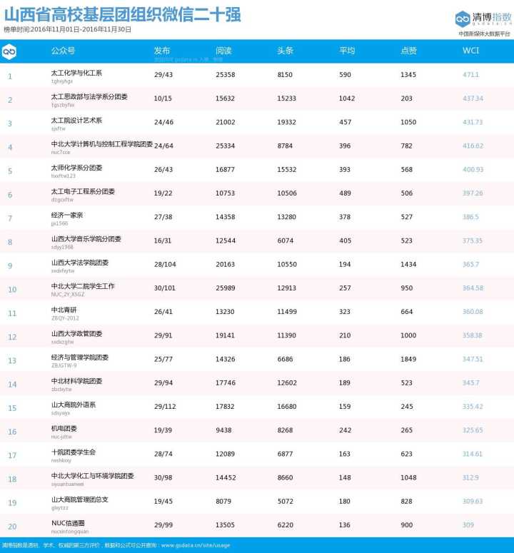 据了解该榜单是团中央《中国青年报》对个大高校官方微信运营数据进行统计分析,为读者提供有价值的数据参考;以真实的数据反映各大高校团组织微信平台推送文章的质量和受欢迎程度等。