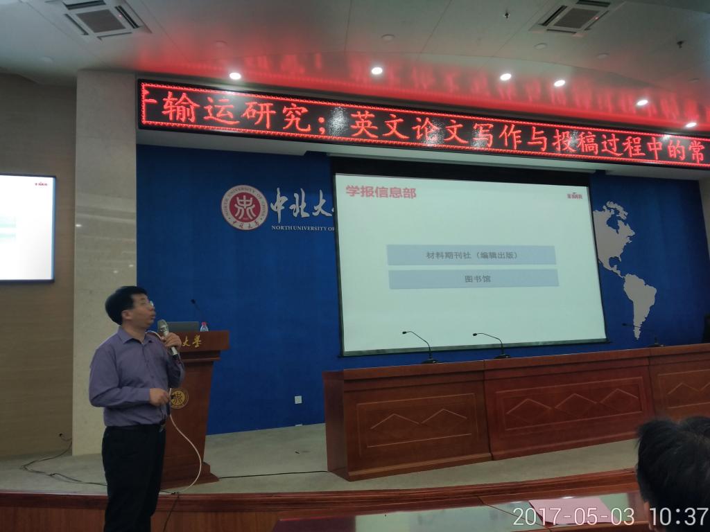 2017年5月3日上午,我院邀请中科院金属所学报信息部副主任\JMST编辑部主任罗东在瑾瑜国际会议中心作题目为“英文论文写作与投稿过程中的常见问题”的主题讲座,讲座由我院党委书记侯华主持。