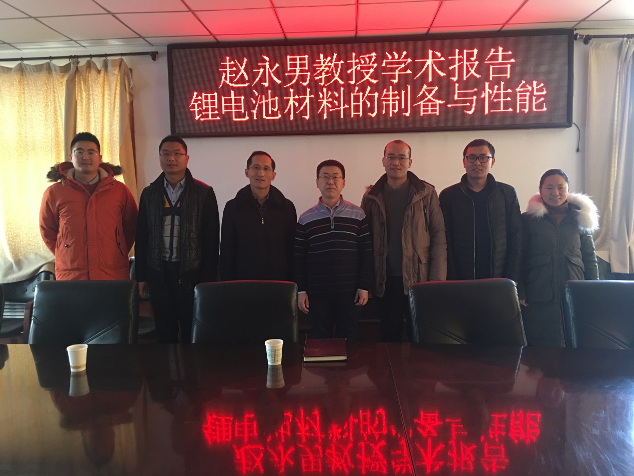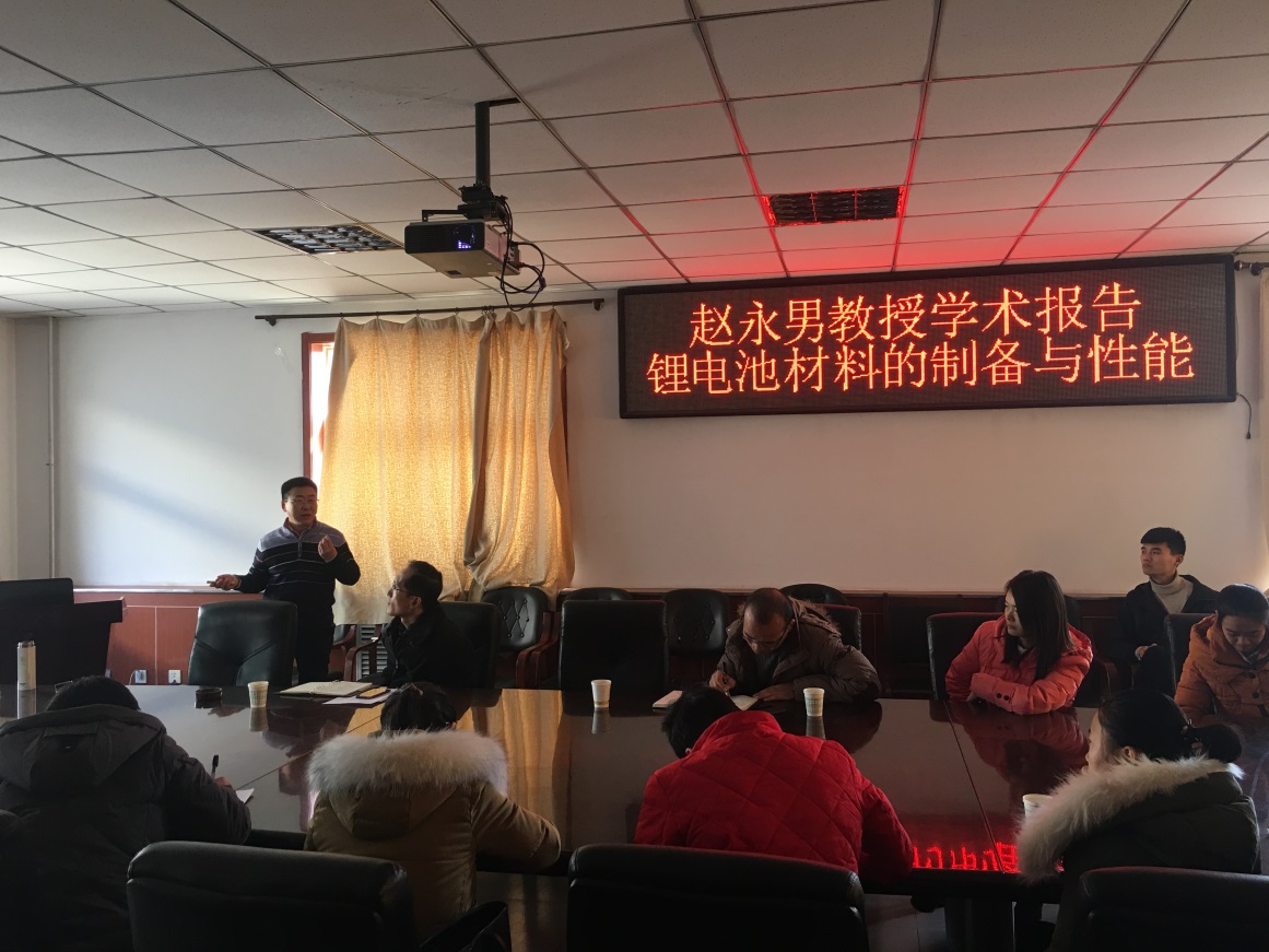 2018年12月12日上午,天津工业大学教授、中国化工学会无机酸碱盐分会学术带头人,中国电工学会超级电容器专业委员会副秘书长赵永男教授应邀来我院进行学术交流。在beat365会议室为我院师生作了题为《锂电池材料的制备与性能》的学术报告。报告由我院科研与学科建设副院长刘斌主持。参会人员有王延忠副教授,王慧奇副教授、渠永平博士、陈彦俊博士、张惠芳博士、李宁博士及相关研究方向的研究生。