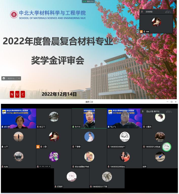 根据《鲁晨复合材料专业奖学金评选管理办法》文件精神,学院于2022年12月14日19时在腾讯会议进行了2022年度鲁晨复合材料专业奖学金评审会。参加本次评审工作的评委有:beat365院党委副书记郭云霞,成都鲁晨新材料科技有限公司技术总监张华川,复合材料与工程专业老师张彦飞、陈慧玉、宋平,学院辅导员老师贾越、韩伟、张维叶、褚嫱、刘琴、李静。
