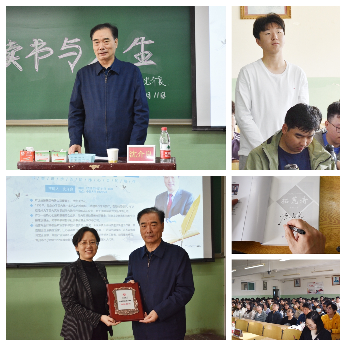 在互动环节中,针对同学们提出的“注重过程还是注重结果”,“始终坚持还是适时放弃”,“失败和成功哪个更重要”等富有辩证意义的问题,沈介良先生结合自己的创业小故事,生动形象地与同学们展开深入讨论,并将亲手签名的《拓荒者》赠与学生,鞭策同学们多积累知识,丰富思想,积蓄力量。活动在阵阵掌声中圆满落幕。