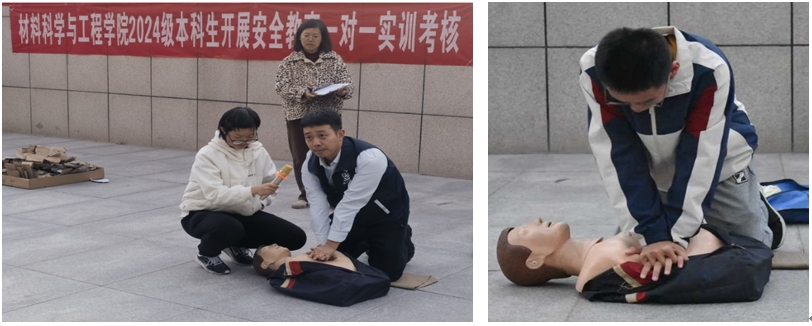 全体新生疏散至安全区域后,活动进入到心肺复苏实操演练环节。陈教官利用模拟人教具,生动讲解了心肺复苏的理论知识和技术要点,并邀请同学们实际操练。随后,陈教官开展了灭火器扑救起火实操演示,详细介绍了灭火器的基本原理、使用要领和注意事项,并现场示范消防器材的正确使用方法。在陈教官的科学指导下,学生们通过各项实际操作巩固了消防安全知识及技能,新生班主任就学生的实训操练进行了安全教育考核。