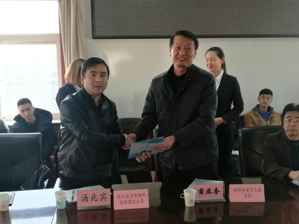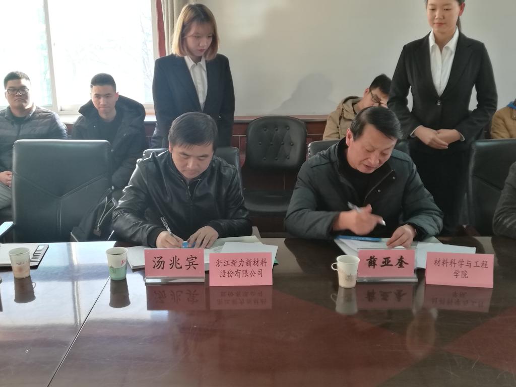 会谈后,在与会人员的共同见证下,汤兆宾先生和薛亚奎书记分别代表双方签订了“共建大学生社会实践基地”合作协议,标志着我院在人才培养工作上迈出了实质性的关键一步。签字仪式结束后,院党委书记薛亚奎进行了总结发言,首先代表学院感谢了浙江新力新材料股份有限公司对学院工作的大力支持,大学生实践基地建立将为我院的实践育人工作提供了一种全新模式,标志着我院人才培养工作迈入一个新时代。希望校企双方进一步深化合作,互惠共赢,为学院和公司的发展寻求更深入的发展途径。