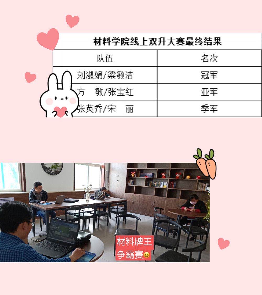 最后,经过激烈的角逐,刘淑娟老师和梁敏洁老师配合默契,获得最终比赛的冠军,喜提“材料牌王”称号,方敏老师和张宝红老师稍有遗憾,只能屈居亚军,张英乔老师和宋丽老师获得比赛的第三名。