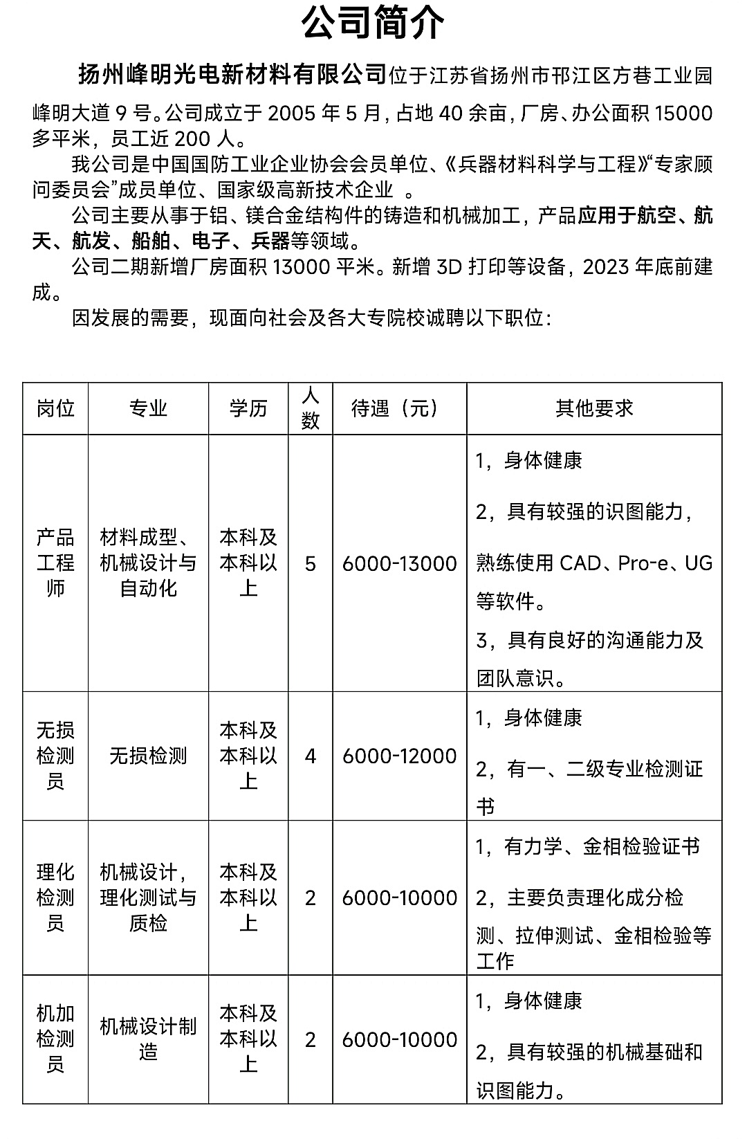 扬州峰明光电新材料有限公司2023校园招聘