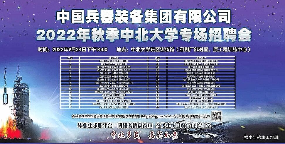 中国兵器装备集团有限公司2022年秋季中北大学专场宣讲会暨招聘会