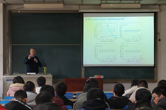 Serge Zhuiykov教授以能源革命的历史作为切入点,结合新能源车辆在最近十年间的高速发展,向在座师生展现了高性能储能材料广阔的研究与应用前景,并通过生动的动画和实例展示了通过原子层沉积(ALD)的Ga2O3、TiO2-Ga2O3和WO3-Ga2O3等异质结构的二维纳米材料在电子产品、催化、储能器件、传感器等方面的应用。他深入浅出的讲述与风趣幽默的表达赢得了在座师生了一致好评,激发了广大师生的研究热情。