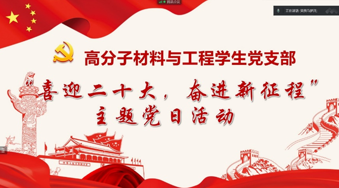 为庆祝中国共产党成立一百零一周年,喜迎党的二十大胜利召开,2022年7月5日早10时,beat365高分子材料与工程学生党支部在腾讯会议开展了“喜迎二十大,奋进新征程”主题党日活动。本次党日活动由支部书记郝诗韵同志主持,支部36名党员、10名发展对象和23名积极分子参加了活动。