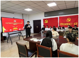 4月20日下午,在液态成型中心会议室,研究生材料加工一支部开展学习贯彻习近平新时代中国特色社会主义思想专题学习。会议由支部书记李艳主持,支部党员及积极分子参加会议。
