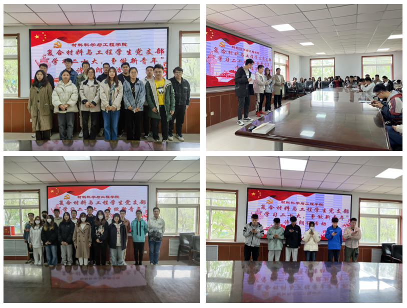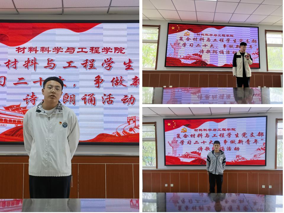 为兴起学习宣传贯彻党的二十大精神热潮,激励广大同志凝心聚力,踔厉奋发,在全面建设社会主义现代化国家的火热实践中绽放绚丽之花,复合材料与工程学生党支部结合党的二十大报告中习近平总书记对青年的寄语,于2023年4月22日上午在学院大会议室开展了主题为“学习二十大·争做新青年”的诗歌朗诵活动。本次活动由支部书记李静同志主持,支部14名党员,11名预备党员,6名发展对象,25名入党积极分子参加了本次主题党日活动。