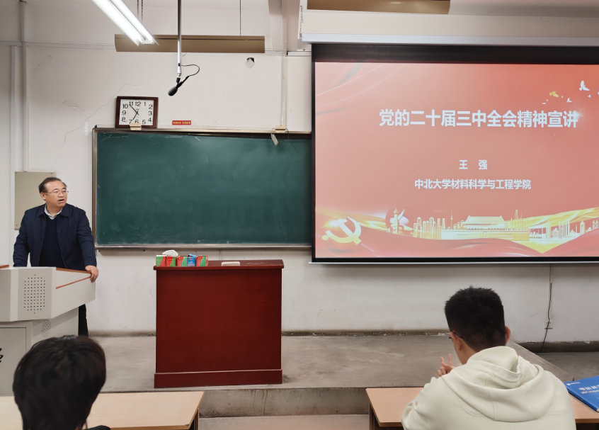 宣讲会上,王强院长首先带领大家学习了党的二十届三中全会的主题、总目标、重点任务和精神等内容,并动员广大党员群众统一思想、凝聚力量,为全面建设社会主义现代化国家、实现中华民族伟大复兴的中国梦而努力奋斗;接着从国内外环境的深刻变化,讲解了科教兴国、科技自立自强以及建设教育强国的重大战略意义。在讲到建设材料强国至关重要时,王院长给同学们详细介绍了制造业、新材料的发展及趋势,强调其重要地位和作用,鼓励同学们投身于制造强国和材料强国建设;最后,王院长对材料科学与工程学科专业的内涵与要点进行了解读,为同学们在专业领域的学习和工作提供精准指导。