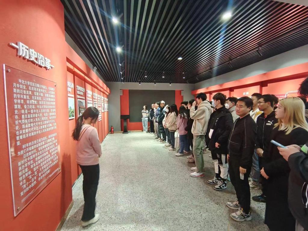 此次联合党日活动的第一站是中北大学校史馆。在讲解员的带领下,各位同学一步步了解了“人民兵工第一校”中北大学在炮火中建校的艰难历史,学习了校歌、校训的内在含义,为“一手拿书一手拿枪”的前辈们深感敬佩,对校园的红色基因有了更深刻的认识,在坚定党员信念的同时也提高了同学们对学校的认同感与自豪感。